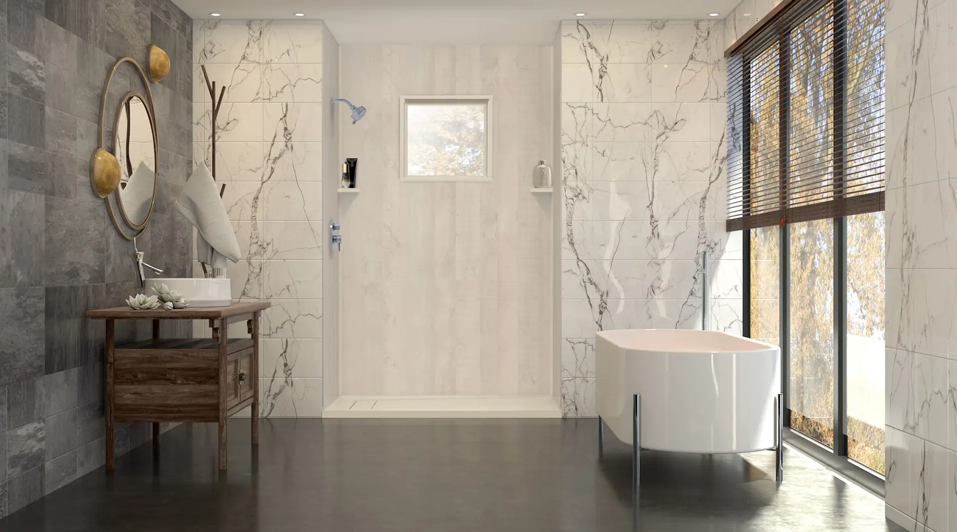Solid surface walls from American Bath and Shower offer seamless beauty and lasting durability—easy to clean, low-maintenance, and perfect for any bathroom space.